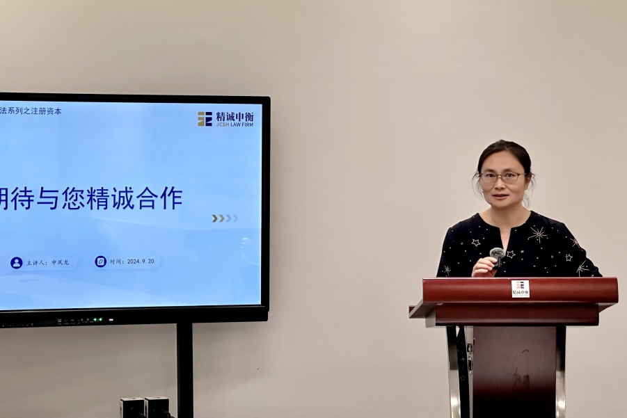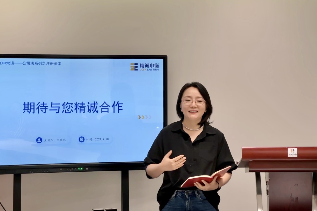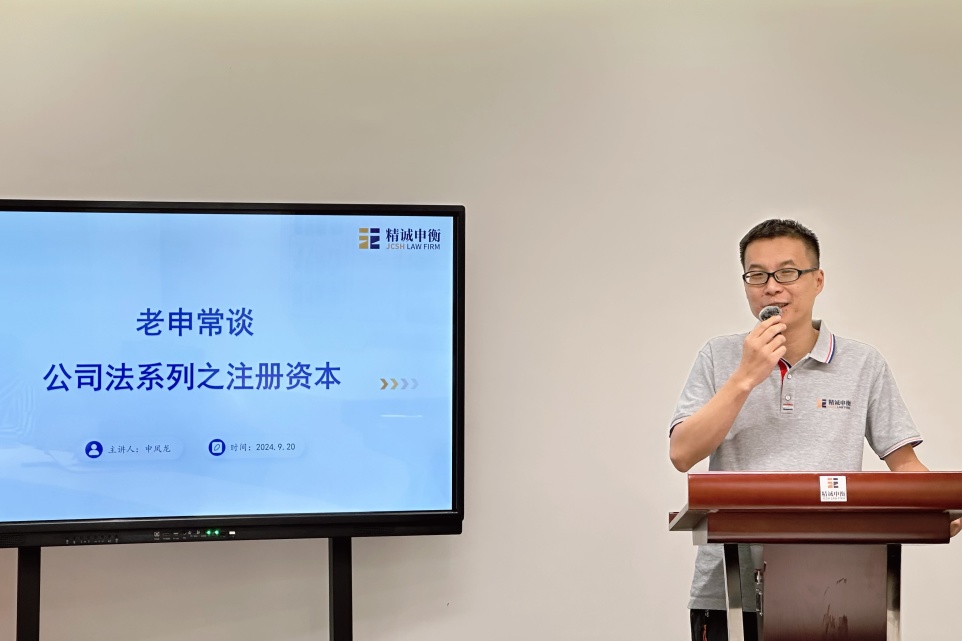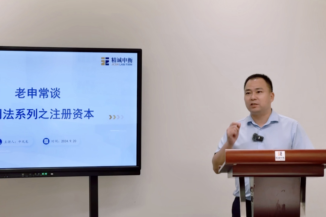 2024年9月20日,上海精诚申衡律师事务所第三十八期“精诚讲堂”圆满开展。本次讲堂由我所申凤龙律师主讲,围绕“企业家应当知晓的《公司法》之注册资本”主题,高级合伙人杨永伟律师主持,熊丽律师、杨虎律师和李玲律师与谈,合伙人杨爱东律师进行总点评。