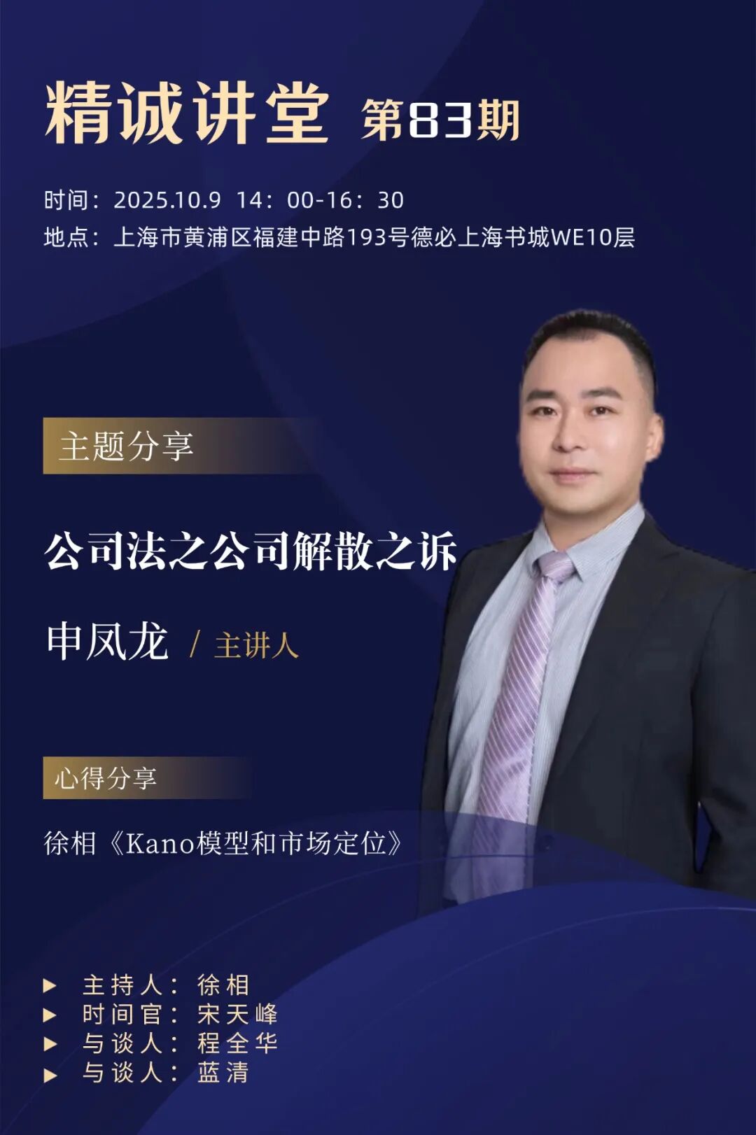 2025年10月9日,上海精诚磐明律师事务所「精诚讲堂」第83期申凤龙律师做《公司法之公司解散之诉》专题分享,徐相老师主持,程全华律师和蓝清律师为与谈人。