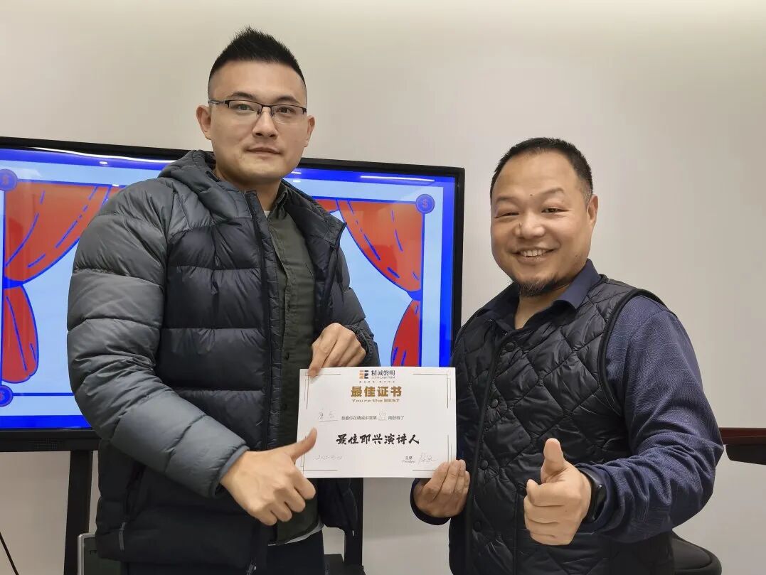 评选颁奖环节,现场观众通过计票评选,选出了第89期精诚讲堂最佳主旨分享人诸荟嘉律师,最佳党建分享人郑晓宇律师,最佳即兴演讲人康乐律师,最佳角色申凤龙律师,徐相老师为获奖者颁发奖状。