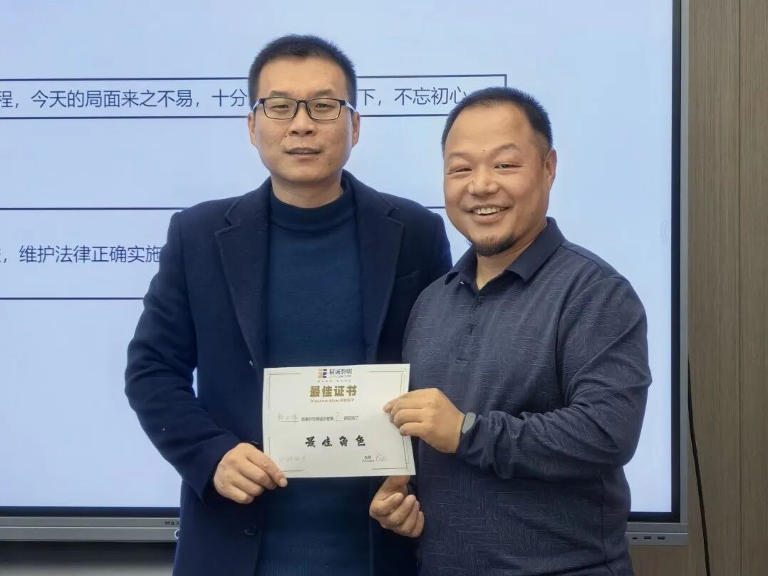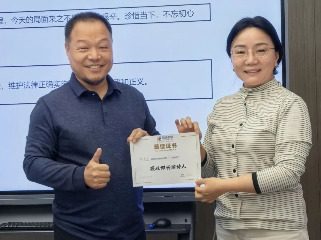 评选颁奖环节,现场观众通过计票评选,选出了第91期精诚讲堂最佳主旨分享人郑晓宇律师,最佳党建分享人和最佳角色杨永伟律师,最佳即兴演讲人杨爱东律师,徐相老师为获奖者颁发奖状。