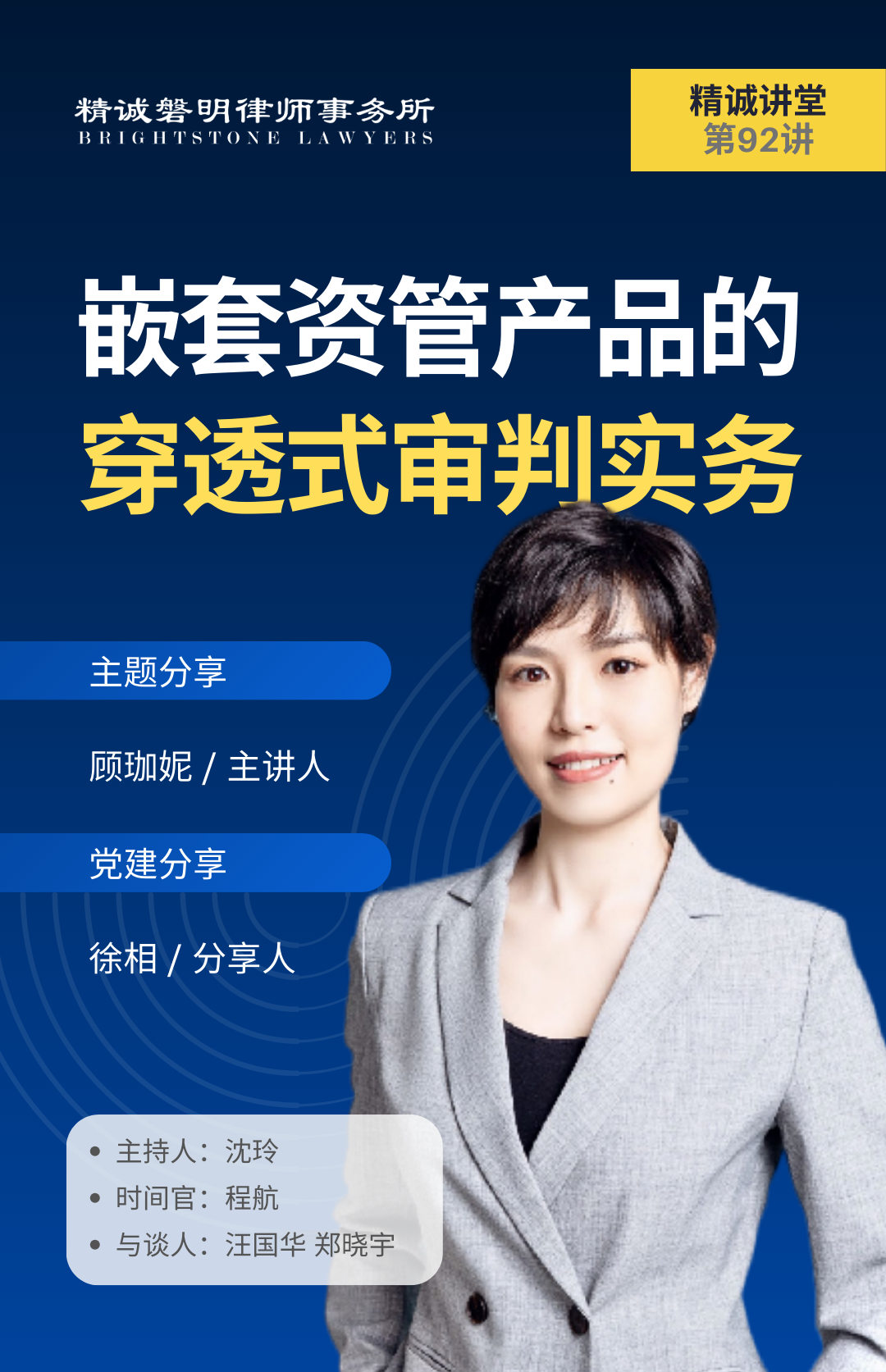 在本次讲堂中,上海精诚磐明律师事务所主任顾珈妮律师,围绕《嵌套资管产品的穿透式审判实务》这一主题,通过剖析两个极具代表性的司法案例,深入阐述了在资管产品结构日益复杂化背景下,司法实践如何运用“穿透式审判”原则厘清法律责任、认定合同效力,为办理相关金融纠纷提供了清晰的裁判逻辑与实务指引。