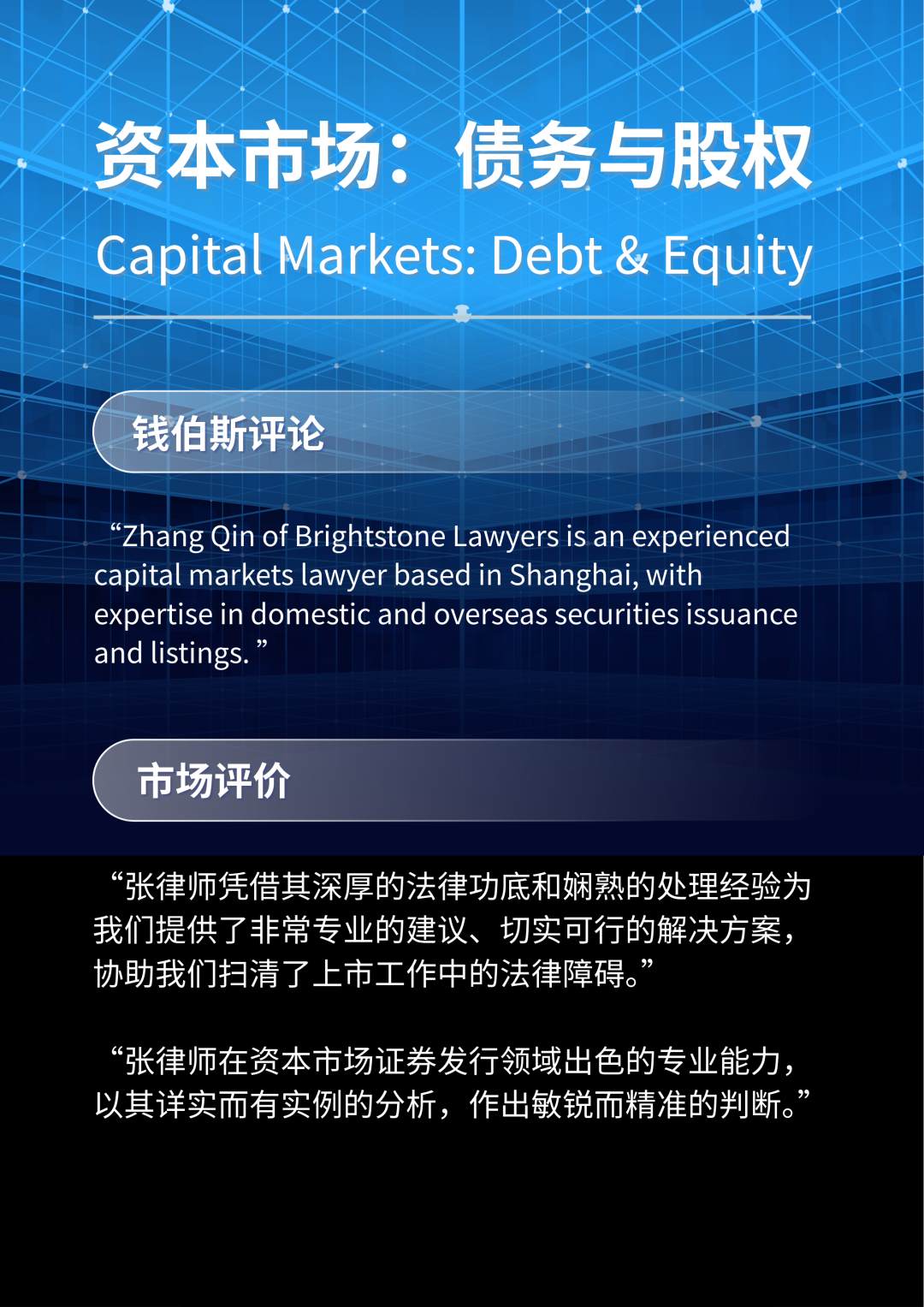 张勤律师始终致力于通过优质、高效、创新的法律服务帮助客户实现战略目标,赢得了客户、同行和监管机构的高度认可。